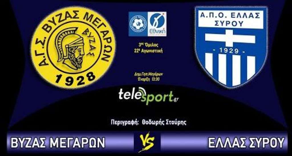 Δείτε ζωντανά την Κυριακή 11 Φεβρουαρίου στις 13:30 τον αγώνα Βύζας Μεγάρων-Ελλάς Σύρου για την 22η αγωνιστική του πρωταθλήματος της Γ Εθνικής.