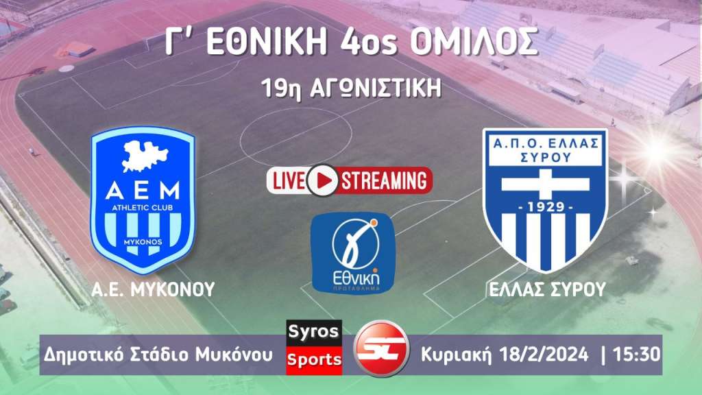 Live stream: ΑΕ Μυκόνου - Ελλάς Σύρου (Γ΄ Εθνική | 3ος Όμιλος | 23η Αγωνιστική)