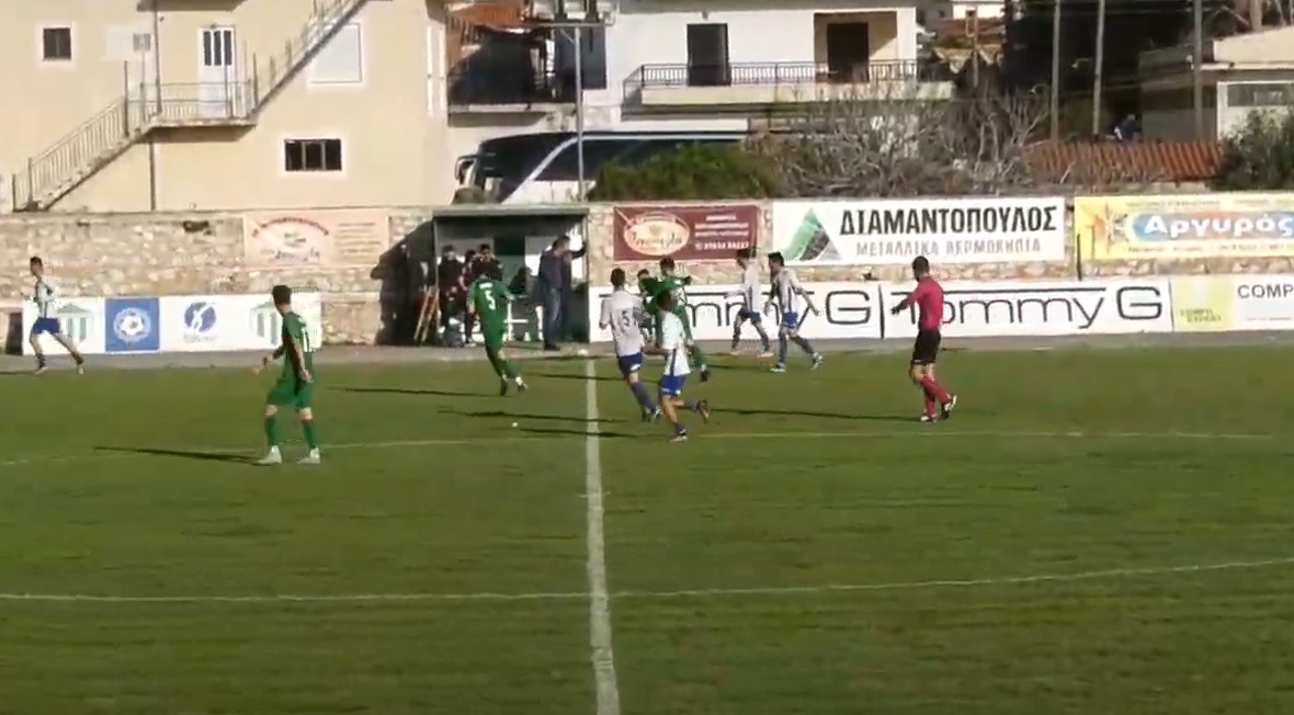 28’ ο Μούντιχα από κοντά με κεφαλιά νίκησε τον γκολκίπερ των Φιλιατρών κι έκανε το 0-1 για την Ελλάς Σύρου.