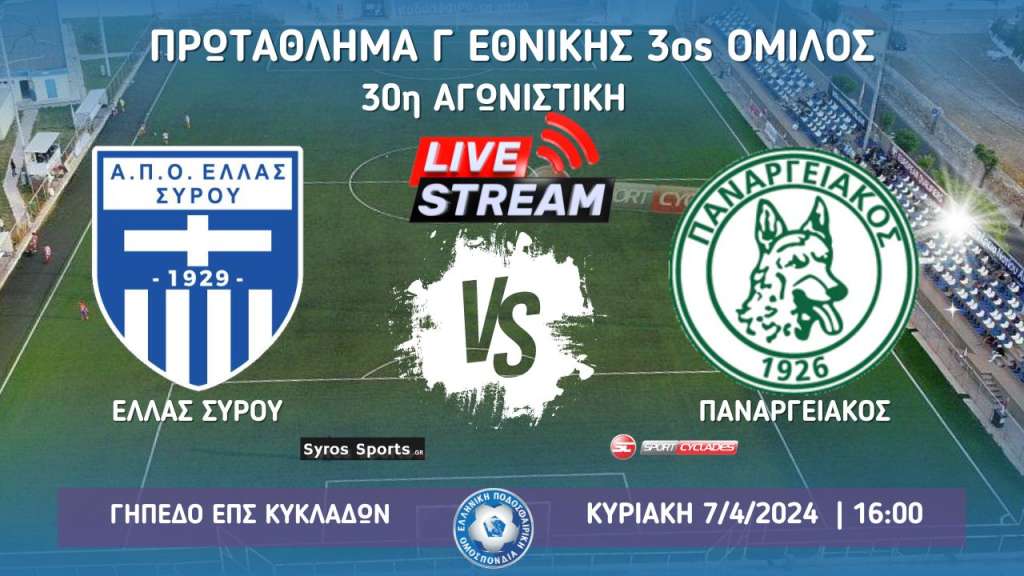 Live stream: Eλλάς Σύρου - Παναιγιάλειος (Γ΄ Εθνική | 3ος Όμιλος | 30η Αγωνιστική)