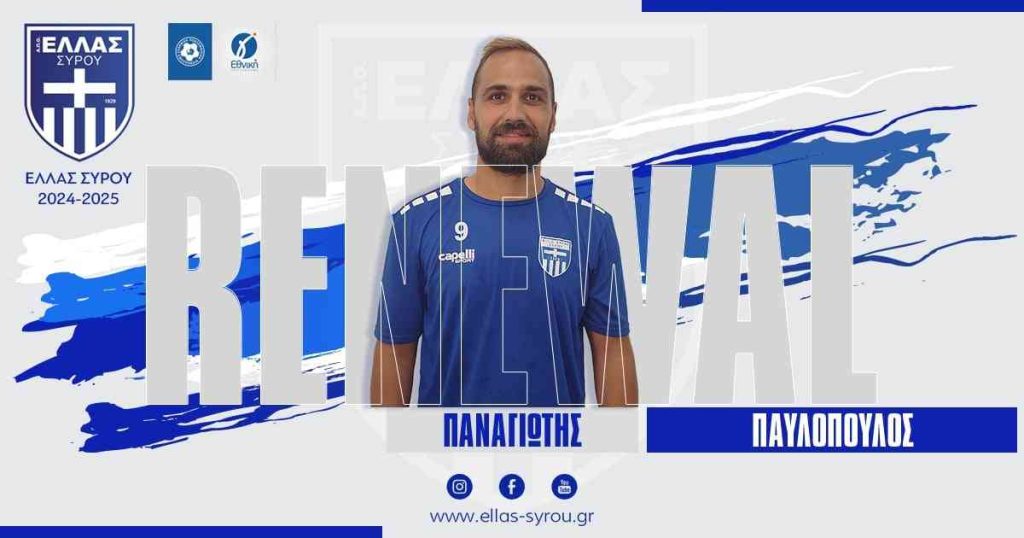 Ακόμη ένας παίκτης της Ελλάς Σύρου που αγωνίστηκε τη σεζόν 2023-24 έδωσε τα χέρια με τη διοίκηση και ανανέωσε τη συνεργασία του με την ομάδα. Ο λόγος φυσικά για τον επιθετικό Παναγιώτη Παυλόπουλο, ο οποίος στάθηκε στο ύψος του και βοήθησε τα μέγιστα την ομάδα της Σύρου στο πρωτάθλημα της Γ’ Εθνικής.