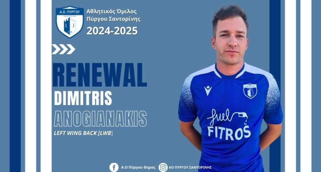 Ο ΑΟ Πύργου ανακοινώνει την ανανέωση της συνεργασίας με τον ποδοσφαιριστή, Δημήτρη Ανωγειανάκη.