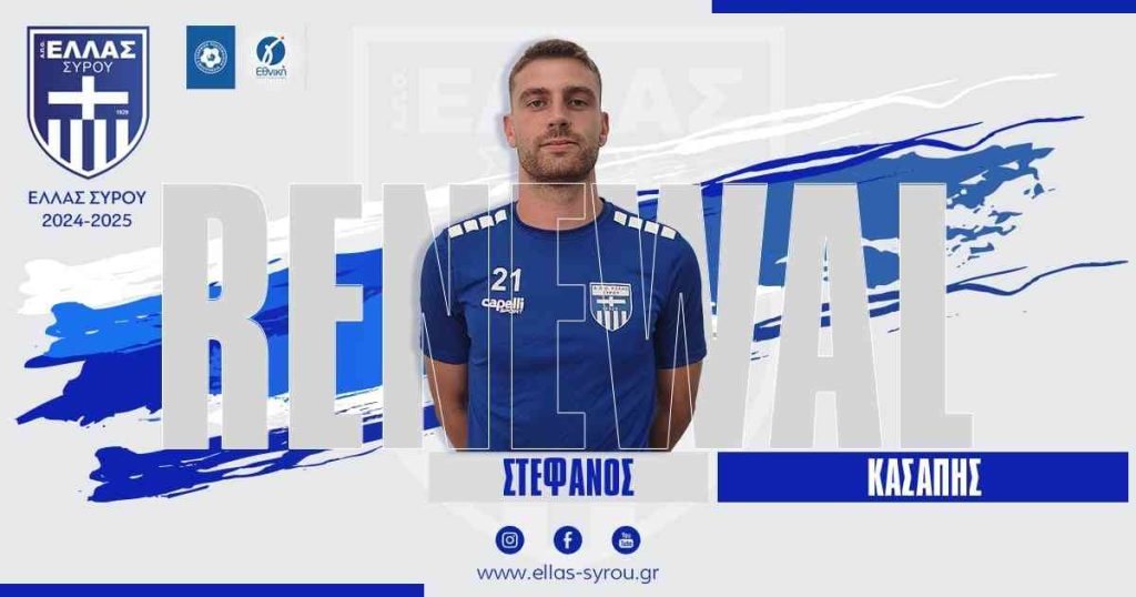 Στην Ελλάς Σύρου θα συνεχίσει να προσφέρει τις υπηρεσίες του ο Στέφανος Κασάπης, με τη διοίκηση της ομάδας να ανακοινώνει την συμφωνία των δύο πλευρών. Ο νεαρός ποδοσφαιριστής είχε σημαντική προσφορά στην περσινή πολύ καλή πορεία της ομάδας και η διοίκηση τον επιβράβευσε, ανανεώνοντας τη μεταξύ τους συνεργασία.