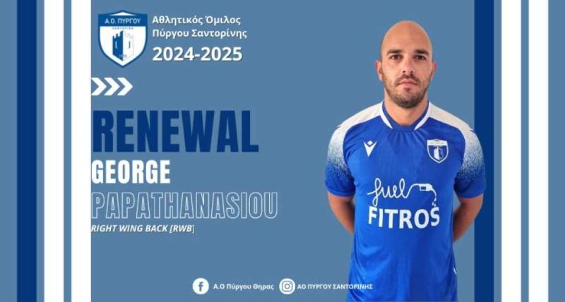 Παίκτης του Α.Ο. Πύργου για 5η συνεχή χρονιά θα είναι ο Γιώργος Παπαθανασίου. Ο παίκτης φόρεσε για πρώτη φορά τα χρώματα της ομάδας της Σαντορίνης το 2020, όπου και θα παραμείνει τουλάχιστον για ακόμη έναν χρόνο. Οι δύο πλευρές, να σημειώσουμε εδώ, πως είναι πάρα πολύ ευχαριστημένες με την έως τώρα συνεργασία τους, γι’ αυτό άλλωστε δεν χρειάστηκε και πολύς χρόνος για να επέλθει συμφωνία. Ο Αλέξανδρος Κωνσταντόπουλος θα έχει τον παίκτη στη διάθεσή, ο οποίος, όπως συμβαίνει τα τελευταία χρόνια, αναμένεται να αποτελέσει ένα από τα… κλειδιά της ομάδας.