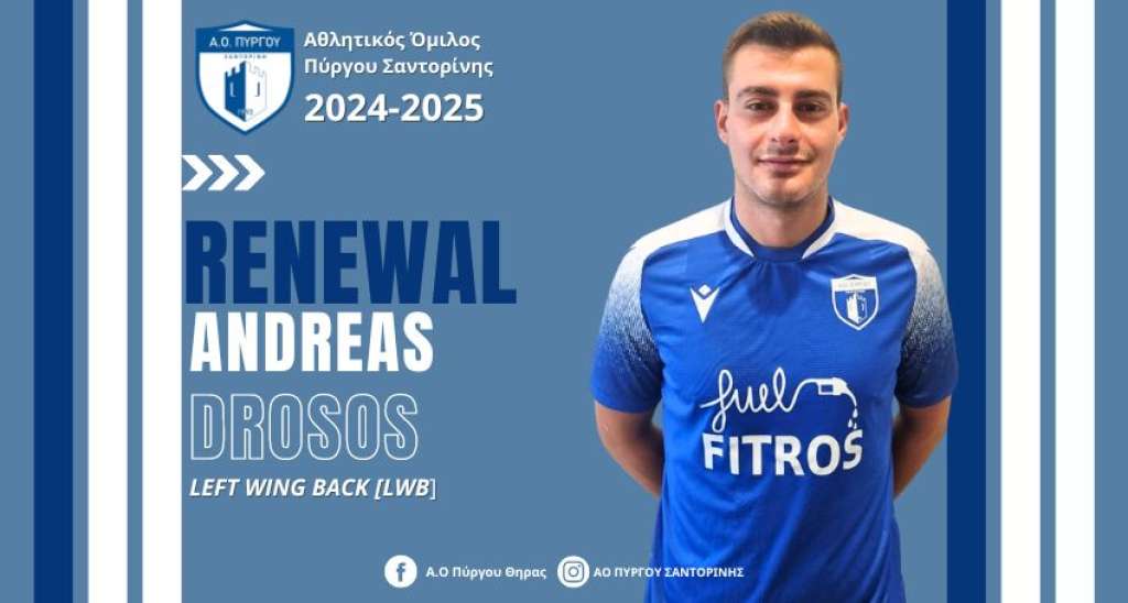 Ο ΑΟ Πύργου ανακοινώνει την ανανέωση της συνεργασίας με τον Σαντορινιό ποδοσφαιριστή, Ανδρέα Δρόσο.