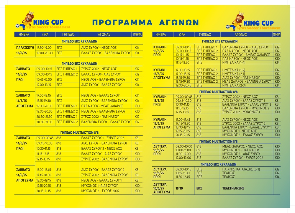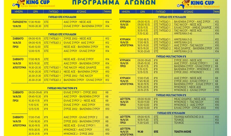 Την Παρασκευή 13 Ιουνίου αρχίζει στην πρωτεύουσα των Κυκλάδων το τουρνουά ποδοσφαίρου με την επωνυμία King Cup. Οι αγώνες θα διεξαχθούν τόσο στο Ενωσιακό γήπεδο της Ερμούπολης, όσο και στο Multiaction στον Πάγο.