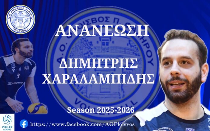 Ο ΑΟ Φλοίσβος Παλαιού Φαλήρου είναι στην ευχάριστη θέση ν’ ανακοινώσει την ανανέωση συνεργασίας, για την αγωνιστική περίοδο του πρωταθλήματος της Volley League 2025-2026, με τον έμπειρο κεντρικό Δημήτρη Χαραλαμπίδη.