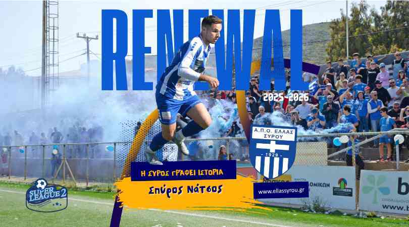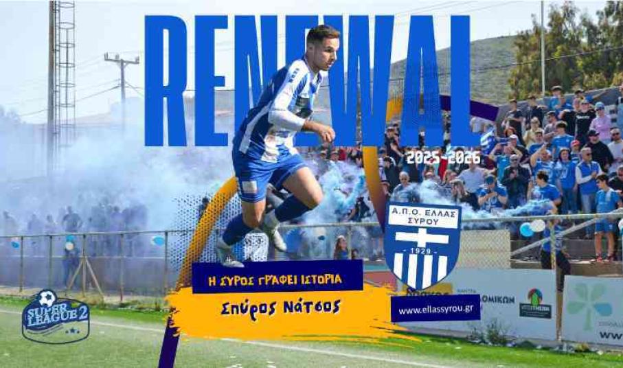Στην ανακοίνωσή της η διοικούσα επιτροπή της Ελλάς Σύρου υπογραμμίζει: Η ΠΑΕ ΕΛΛΑΣ Σύρου συνεχίζει τον σχεδιασμό της ενόψει της νέας αγωνιστικής περιόδου, διατηρώντας στο ρόστερ της έναν ακόμη βασικό ποδοσφαιριστή απο την περσινή μεγάλη επιτυχία. Ο λόγος για τον Σπύρο Νάτσο, ο οποίος υπέγραψε την ανανέωση του συμβολαίου του και θα αγωνιστεί για δεύτερη συνεχόμενη χρονιά με τη φανέλα της ομάδας μας. Ο 27χρονος ποδοσφαιριστής συνεχίζει να βρίσκεται υπό τις οδηγίες του Παναγιώτη Χροστοφιλέα.