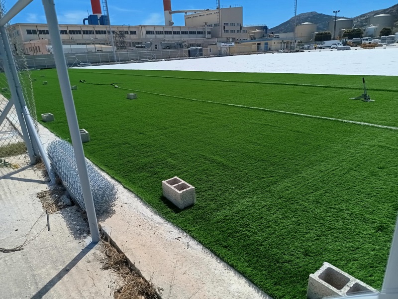 Με εντατικούς ρυθμούς συνεχίζονται οι εργασίες στο γήπεδο της Ερμούπολης, καθώς άρχισε και η τοποθέτηση του συνθετικού χλοοτάπητα.