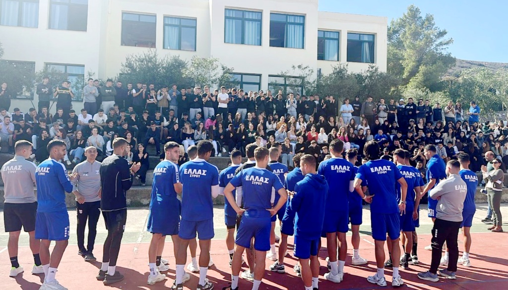 Κατά τη διάρκεια της επίσκεψης, οι παίκτες και τα στελέχη της ομάδας είχαν την ευκαιρία να συνομιλήσουν με τους μαθητές προσκαλώντας τους να γεμίσουν τις κερκίδες και να στηρίξουν την ομάδα της Σύρου σε αυτή τη σημαντική αναμέτρηση.