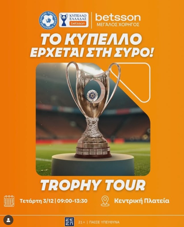 Επίσης, ευχαριστούμε θερμά τη Betsson, επίσημο χορηγό του Κυπέλλου Ελλάδος, η οποία θα αναλάβει τη διοργάνωση της εκδήλωσης «Trophy Tour Κυπέλλου Ελλάδος» μέσω της οποίας η προβολή της Σύρου θα είναι μεγάλη.