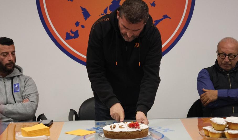 Ο πρόεδρος της Ένωσης, Ρένος Φρέρης κατά τη διάρκεια του σύντομου χαιρετισμού του τόνισε ότι μπορεί αυτή τη στιγμή να γίνεται η κοπή της πίτας με παρόντα μόνο τα Σωματεία από το νησί της Σύρου, όμως ευελπιστεί πως άμεσα θα πραγματοποιηθεί μία μεγάλη εκδήλωση και εκεί θα γιορτάσουν όλοι μαζί.