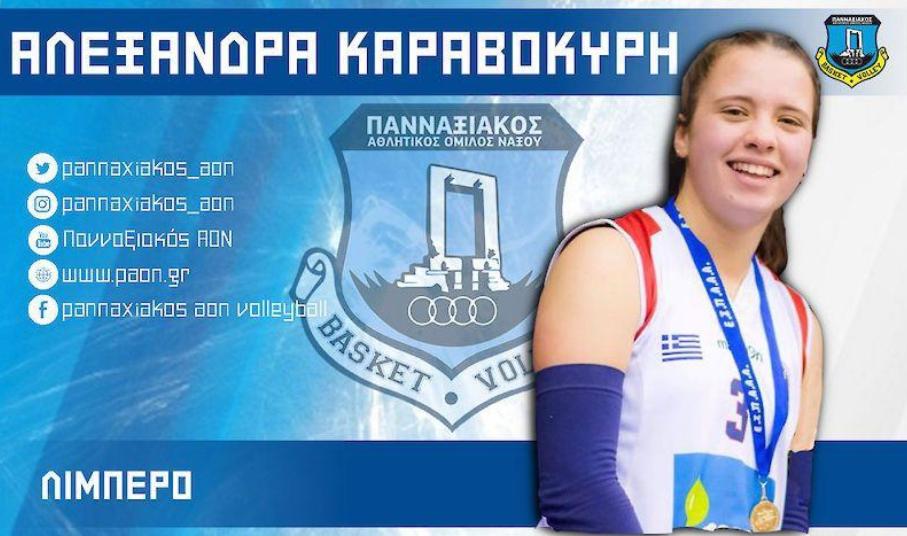 Ο Πανναξιακός συνεχίζει την προσπάθειά του να ενισχύσει όσο το δυνατόν καλύτερά γίνεται, ώστε να εμφανιστεί ακόμη πιο ανταγωνιστικός στο πρωτάθλημα της Volleyleague γυναικών. Η ομάδα της Νάξου προχώρησε στην ανακοίνωση απόκτησης της 18χρονης Αλεξάνδρας Καραβοκύρη, μέλους της εθνικής κορασίδων και η οποία ταξιδεύει στο νησί για να δημιουργήσει ένα πολύ δυνατό δίδυμο με την Ξένια Κακουράτου όσον αφορά τη θέση του λίμπερο.