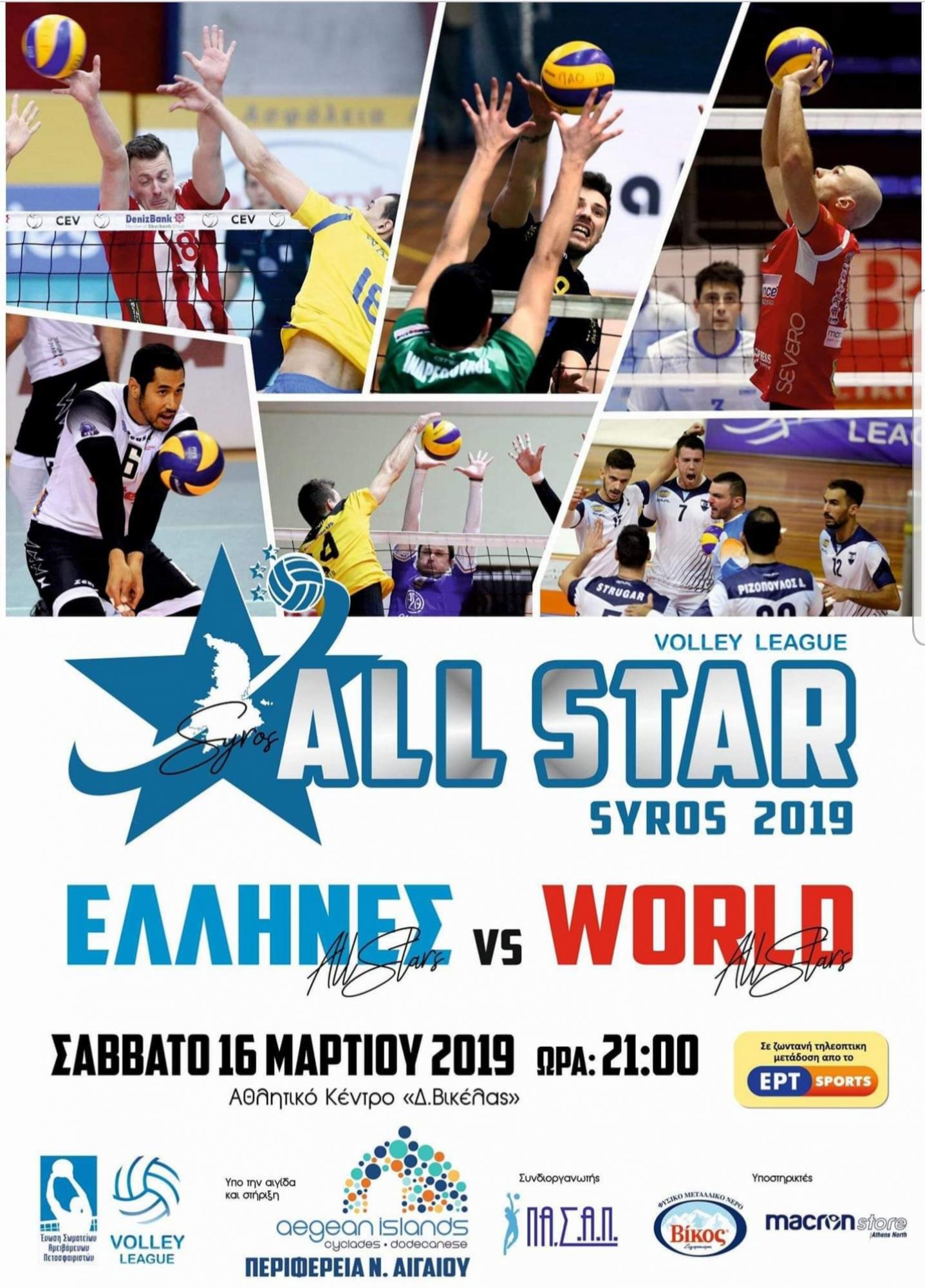 Η αυλαία του ALL STAR GAME 2019 θα ανοίξει αύριο το απόγευμα στις 17:00 με το τουρνουά βόλεϊ μεταξύ των σχολείων της Σύρου και την παρουσία των αθλητών που θα αγωνιστούν στις ομάδες των Ελλήνων και των Ξένων.
