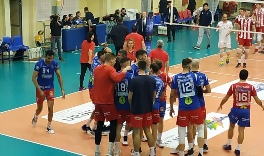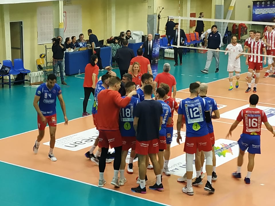 Ο Εβάντρο από την γραμμή του σέρβις πίεσε τον Ολυμπιακό, για να έρθει ο Μήλης στην κόντρα να ανοίξει το σκορ 1-0. Ο Ραουβέρντινγκ σταμάτησε τον Μήλη και ο Ολυμπιακός πέρασε για πρώτη φορά μπροστά στο σκορ 2-3. Εκτός αγνωστικού χώρου το σέρβις του Μήλη 3-4. Νέο μπλοκ του Ραουβέρντινγκ πάνω στον Μήλη 3-5. Ο Παπαδόπουλος πήρε το μπλοκ άουτ 4-5. Ο Σμαραγδής με επίθεση πρώτου χρόνου έκανε το 4-6 για τους «ερυθρόλευκους. Διπλό λάθος από τον Μήλη ο οποίος είναι αγχωμένος, αφού δεν κατάφερε να τελειώσει τις προηγούμενες φάσεις 4-8. Ο Φίλιο με μπλοκ πάνω στον Χριστοφιδέλη μείωσε για τον Φοίνικα σε 6-8. Λάθος του Ραουβέρντινκγ σε επίθεση πίσω από τα τρία μέτρα, δεν κατάφερε να περάσει τη μπάλα 7-8. Νέο μπλοκ από τον Φίλιο 8-8 και το «Πειρατικό» με τον Βουλκίδη στο σερβίς τρέχει σερί 4-0. Εκτός αγωνιστικού χώρου το σέρβις του Πετρέα 13-14 και ο Μήλης με άσσο έφερε το σετ στα ίσα. Οι δύο ομάδες προσπαθούν να ξεφύγουν η μία από την άλλη, όμως δεν τα έχουν μέχρι στιγμής καταφέρει. Ο Ολυμπιακός στο ξεκίνημα ξέφυγε με τέσσερις πόντους, όμως ο Φοίνικας αντέδρασε άμεσα και ισοφάρισε σε 8-8. Ο Παπαδόπουλος δεν τελείωσε όπως θα ήθελε την επίθεση, η μπάλα κατέληξε εκτός αγωνιστικού χώρου (14-16) και ο κ. Παβλίσεβιτς κάλεσε τάιμ άουτ. Ο Βουλκίδης με επίθεση πρώτου χρόνου μείωσε σε 15-16. Φάση διαρκείας με ωραίες άμυνες κι από τις δύο ομάδες, όμως η φάση τελείωσε άδοξα για τον Φοίνικα με τον διαιτητή να χρεώνει λάθος 17-19. Τάιμ άουτ κάλεσε ο κ. Μουνιόφ μετά το λάθος του παίκτη του και την ισοφάριση του Φοίνικα σε 19-19. Ο Μήλης με επίθεση στη διαγώνιο ισοφάσε σε 20-20. Ο Παπαδόπουλος ισοφάρισε σε 22-22, καθώς ο Δαρίδης δεν κατάφερε να βγάλει άμυνα. Ο Ζουπάνης πολύ ψηλά και επίθεση στην πίσω ζώνη 22-23. Ο Διαιτητής δεν είδε υπέρβαση κι έδωσε τον πόντο στον Ολυμπιακό με όλο τον πάγκο της ομάδας της Σύρου να διαμαρτύρεται και ο Λέσκοφ δέχθηκε κίτρινη κάρτα. Εδώ ο διαιτητής έκανε λάθος αφού η φάση ήταν καθαρή και ο Ολυμπιακός λόγω ονόματος πήρε τον πόντο 22-24. Ο Εβάντρο μείωσε σε 23-24 και ο Βουλκίδης πίεσε από το σέρβις και ο Φίλιο σαν σε… προπόνηση ισοφάρισε σε 24-24 μέσα σε έξαλλους πανηγυρισμούς από τους φίλους της ομάδας. Ο Εβάντρο στην κόντρα μετά την άμυνα στην επίθεση του Χριστοφιδέλη το 25-24 και το «Πειρατικό» σ’ αυτό το κρίσιμο σημείο μετρά σερί 3-0. Ο Βουλκίδης με έναν… κεραυνό τελείωσε το σετ αφού ο Στεφάνου δεν κατάφερε να βγάλει άμυνα (26-24) και ο Φοίνικας άνοιξε το σκορ στα σετ 1-0.