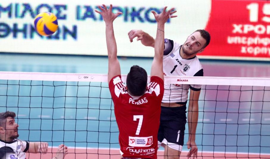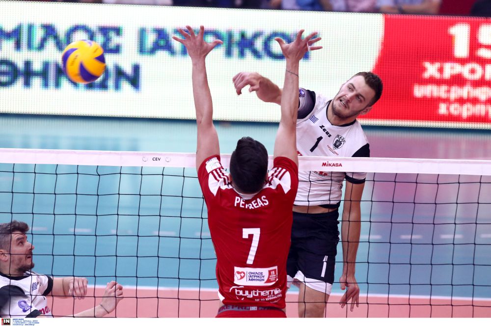 Στο 1ο σετ με το σερβίς του Όκολιτς και τις κόντρες του Σαφράνοβιτς προηγήθηκε 14-11 και κράτησε το +3 μέχρι το 20-17. Ο Ραουβέρντινκ και με άσσο ο Πετρέας μείωσε 19-20 καθώς η υποδοχή του ΠΑΟΚ έκανε λάθη. Η ομάδα της Θεσσαλονίκης κράτησε το προβάδισμα 23-22 με την επίθεση του Σαφράνοβιτς αλλά ο ίδιος παίκτης έχασε το σερβίς και ο Σμιτ με μπλοκ στον Μουαγκουτούτια έκανε το 24-23 για τον Ολυμπιακό. Ο Τακουρίδης ισοφάρισε αλλά με δύο πόντους του Αλεξίεφ έγινε το 26-24 εν μέσω αποθέωσης.
