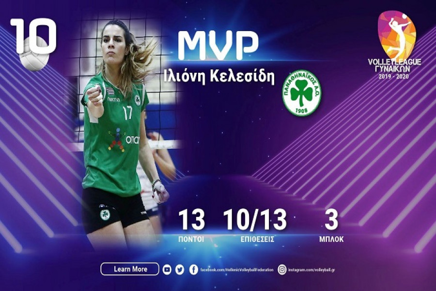 Η Ιλιόνη Κελεσίδη είναι η MVP της 10ης αγωνιστικής του πρωταθλήματος της Volleyleague γυναικών. Η κεντρική του Παναθηναϊκού με 13 πόντους με 10/13 επιθέσεις και 3 μπλοκ ήταν η πολυτιμότερη της ομάδας της στη νίκη με 3-2 σετ στην έδρα του Πανναξιακού.