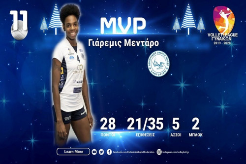 Το «μαύρο διαμάντι» του Α.Ο. Θήρας είναι η MVP της 11ης αγωνιστικής της Volley league γυναικών. Η Γιάρεμις Μεντάρο έδωσε για μία ακόμη αγωνιστική πολύτιμες λύσεις στην ομάδας καθώς κόντρα στον Άρη, στο ματς με το οποίο ολοκληρώθηκε η πρώτη αγωνιστική του πρωταθλήματος σημείωσε 28 πόντους με 21/35 επιθέσεις, 5 άσσους και 2 μπλοκ, οδηγώντας την ομάδα της Σαντορίνης στη 10η φετινή της νίκη.