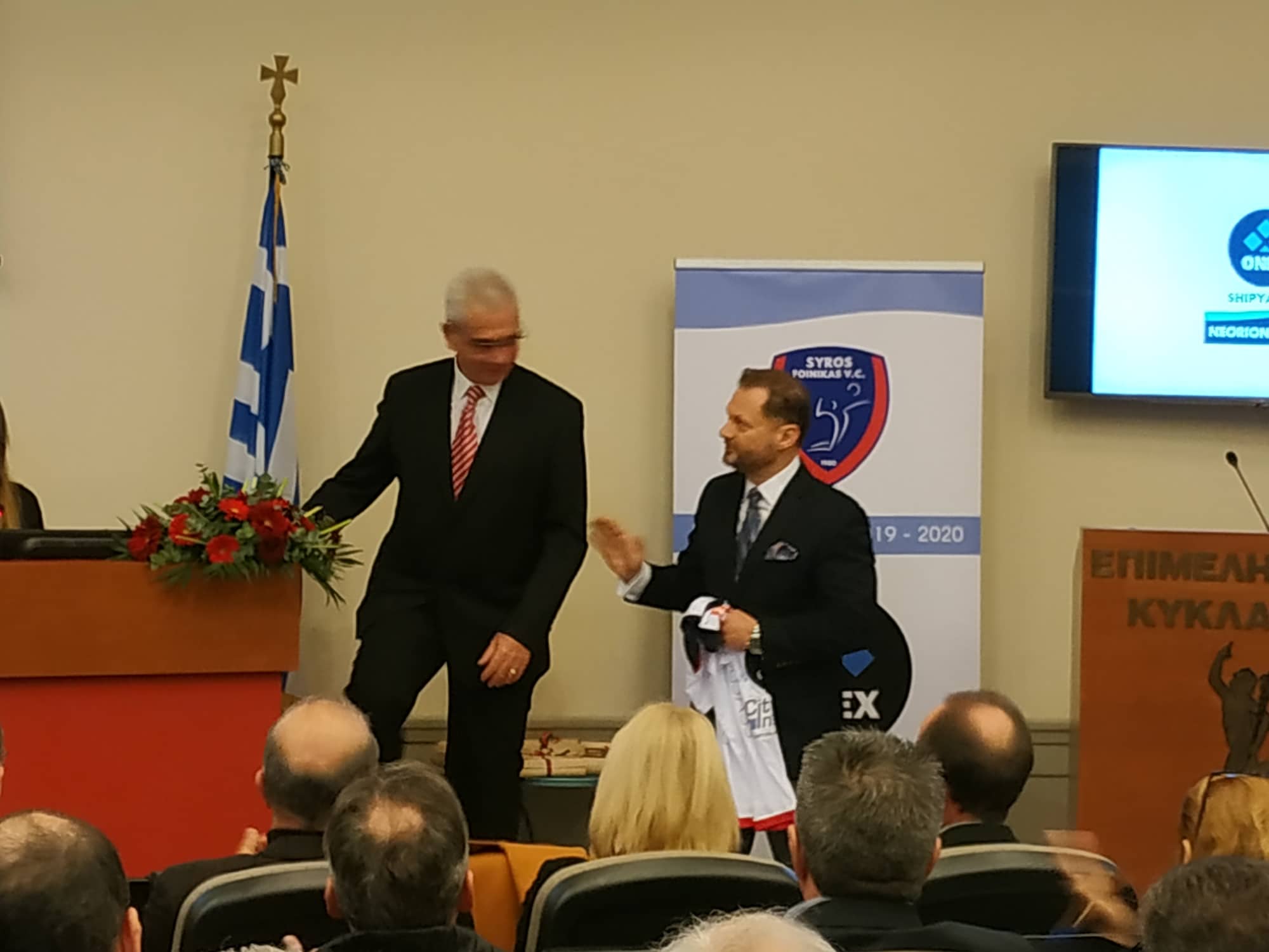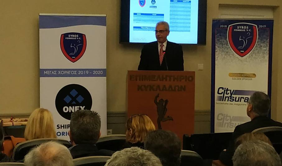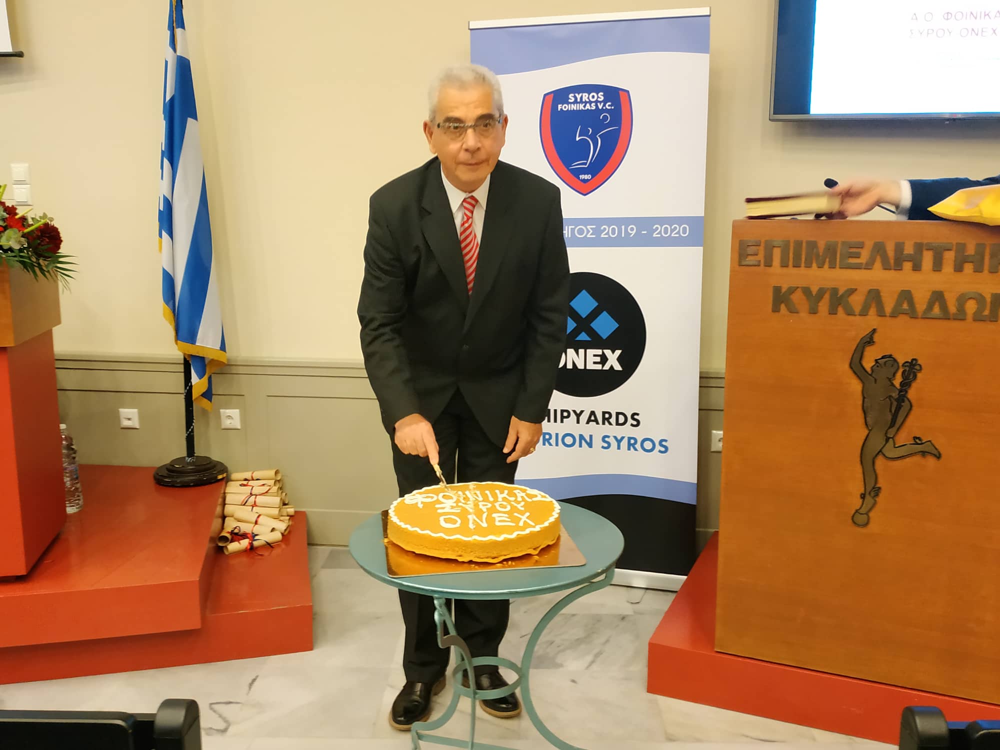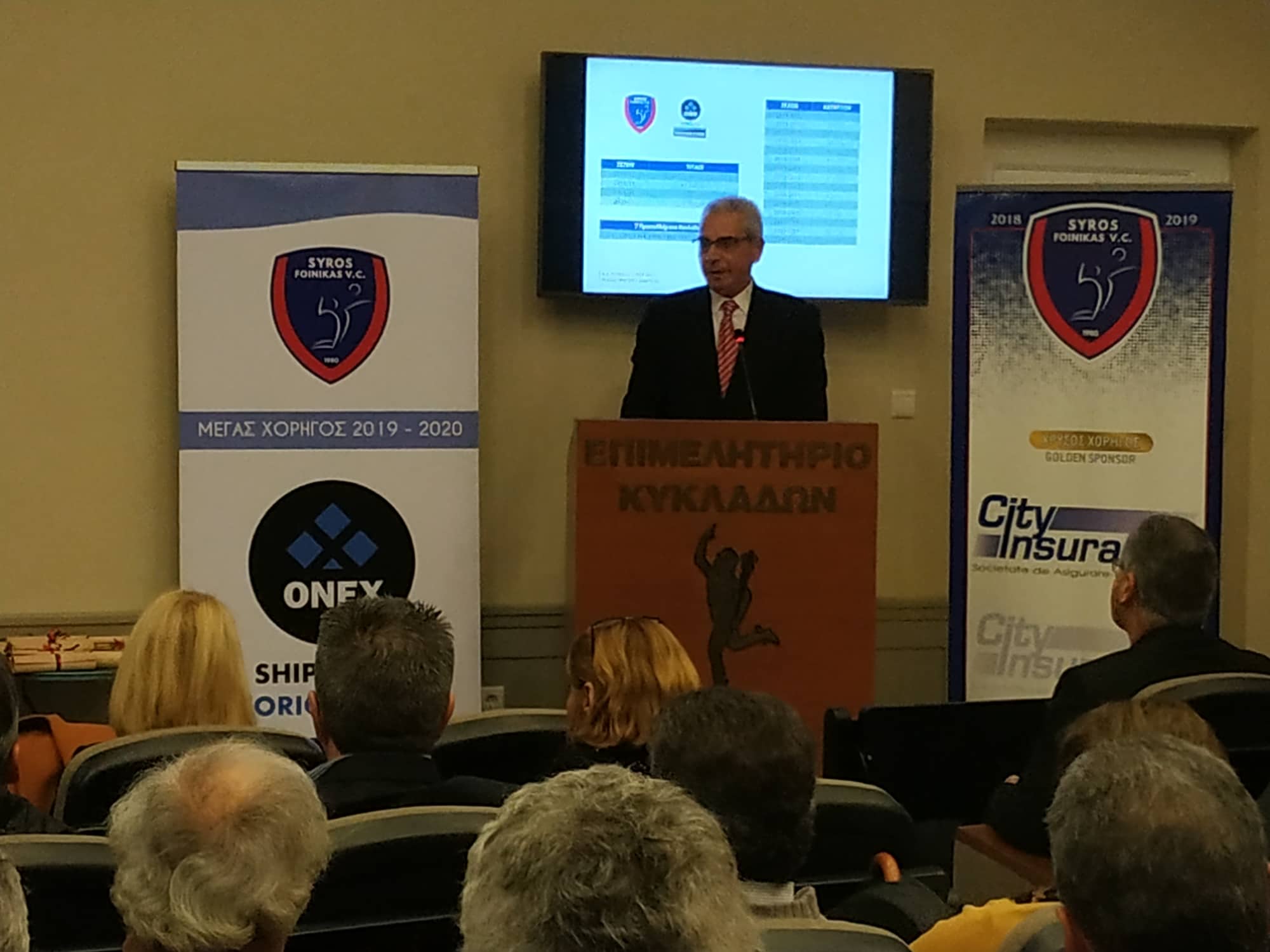 Από την πλευρά του ο πρόεδρος της ONEX  Νεώριον Σύρου κ. Πάνος Ξενοκώστας αναφέρθηκε στην απόφαση του να στηρίξει την ομάδα του Φοίνικα και πόσο σημαντικό είναι το «Πειρατικό» για το ίδιο το νησί. «Από την αρχή πίστευα πως το Νεώριο και η Ναυπηγοεπισκευαστική βιομηχανία έπρεπε να σωθεί, για το καλό όλων, τόσο των εργαζομένων όσο και του ίδιου του νησιού. Σας ευχαριστώ που με δεχθήκατε, με αγκαλιάσατε και που με βοηθήσατε όλοι. Το ιστορικό Νεώριο ήταν βαθιά πληγωμένο και είχε φτάσει το… τέλος του κι αν δεν γίνονταν όλες αυτές οι κινήσεις θα χάνονταν για πάντα. Σήμερα είναι εδώ δυνατό, ισχυρό και είμαι περήφανος γι’ αυτό. Είμαι εδώ ως κεντρικός χορηγός της ομάδα μας του Φοίνικα Σύρου – ONEX, της ομάδας που ενώνει όσους την αγαπούν και επειδή αγαπιέται εύκολα την αγάπησα κι εγώ. Όμως αυτήν την ομάδα δεκαετίας τώρα κάποιοι την δημιούργησαν, κάποιοι δούλεψαν σκληρά, πόνεσαν οικονομικά και την έφεραν έως εδώ. Ο Φοίνικας Σύρου – ONEX  τώρα είναι μία από τις πιο ισχυρές ομάδες της χώρας μας.   Σε πόλους αυτούς που δούλεψαν τόσο σκληρά τους αξίζουν πολλά συγχαρητήρια. Εγώ, όμως είναι γνωστό βρήκα μία ομάδα πληγωμένη και στο χείλος του γκρεμού. Γι’ αυτό και μου ζητήθηκε η βοήθεια όπου εγώ την έδωσα άμεσα και με αγάπη. Αυτό κάνω με ότι καταπιάνομαι στη ζωή μου. Η ομάδα δεν είναι δική μου κι αυτό της δίνει μεγαλύτερη αξία. Η ομάδα είναι της Σύρου, είναι των συμπολιτών, είναι και δική μου γιατί έχω την τιμή να είμαι ένας απ’ αυτούς. Θα συνεχίσω να βοηθώ με τις δυνάμεις μου έχω, όσο αυτή η ομάδα ενώνει και όσο ενώνει θα προσπαθώ αυτή η ομάδα να φτάσει κάποτε στην κορυφή. Κανείς στη ζωή δεν μπορεί μόνος, εδώ είμαστε όλοι. Είναι η περιφέρεια, ο Δήμος, το επιμελητήριο, οι χορηγοί, αλλά και ο απλός φίλαθλος που αγαπά και στηρίζει αυτήν την ομάδα. Όλοι μαζί, λειτουργώντας σωστά μπορούμε να φτάσουμε μέχρι την κορυφή. Εγώ είμαι εδώ ως ισχυρή οικονομική οντότητα του νησιού, απλώνω το χέρι και με αγάπη και σεβασμό σας λέω πάμε όλοι μαζί. Θα ήθελα να πω στους αθλητές της ομάδας και στο τεχνικό τιμ, πως θέλω να είστε πρωταθλητές στην προσπάθεια, στο θέμα στο ήθος κι όταν το καταφέρετε αυτό τότε θα φτάσει και η στιγμή που θα γίνεται και πρωταθλητές στη βαθμολογία. Θα είμαστε όλοι μαζί να σας χειροκροτούμε στην προσπάθεια και θα είμαστε εκεί όταν τα καταφέρετε να ζήσουμε το όνειρο που θα μας χαρίσετε».