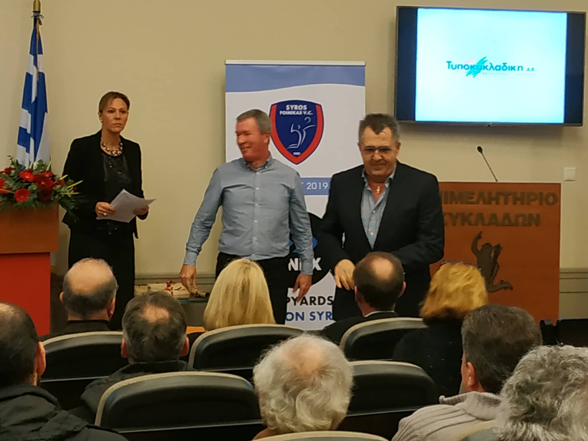 Τώρα, κατά τη διάρκεια της εκδήλωσης βραβεύτηκαν όλοι οι χορηγοί, μικροί και μεγάλοι που στέκονται στο πλευρό της ομάδας και προσφέρουν σύμφωνα με τις δυνατότητές τους. Μεταξύ αυτών και ο δικός μας, Γιώργος Βακόνδιος, ιδιοκτήτης της Τυποκυκλαδικής. Βέβαια δεν θα μπορούσε κανείς να παραβλέψει και τη σημαντική βοήθεια – χορηγία της City Insurance, που εδώ και τέσσερα χρόνια στηρίζει τις προσπάθειες του Φοίνικα Σύρου – ONEX.