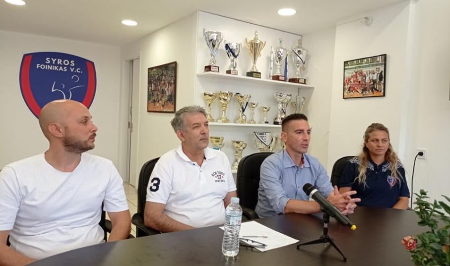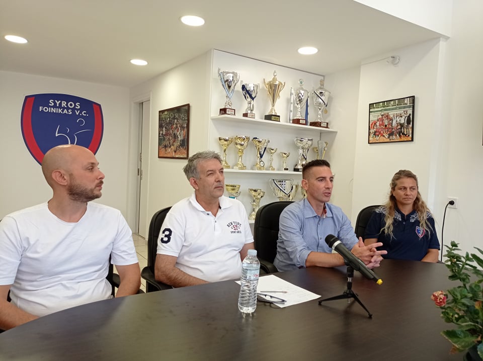 Ο πρόεδρος του Φοίνικα ΟΝEX αρχικά καλωσόρισε στην Σύρο και στα γραφεία του Φοίνικα ONEX τον Fulvio Bertini. «Βρισκόμαστε στα γραφεία της ομάδας όπου και έχουμε την χαρά να σας παρουσιάσουμε τον νέο μας προπονητή Fulvio Betrini. Δεν θέλω να πω κάτι παραπάνω για τον νέο μας προπονητή, αφού θα σας τα πει ο ίδιος. Μιας και μου δίνεται η ευκαιρία θα ήθελα να πω στο σημείο αυτό πως έχει συμπληρωθεί το σταφ της ομάδας, αφού έκλεισε και ο βοηθός του κ. Bertini  ο οποίος είναι ο Λουίτζι Παρίζι. Επίσης στην ομάδα μας βρίσκεται ο φυσικοθεραπευτής Τζέιμς Νεόφυτος, αλλά και η Άννα Μουστάκα, η οποία θα κρατά και πάλι τα στατιστικά μας. Θέλω για ακόμη μία φορά να καλωσορίσω στη Σύρο τον Φούλβιο και πιστεύω πως και φέτος θα συνεχίσει ο Φοίνικας να είναι ανταγωνιστικός και όλοι μαζί θα χαρούμε με τις επιτυχίες της ομάδας μας».