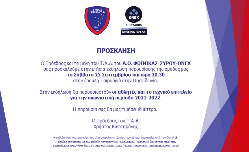 Ο «Α.Ο. Φοίνικας Σύρου – ONEX» ενημερώνει τους φιλάθλους του ότι το Σάββατο 25 Σεπτεμβρίου και ώρα 20:30 θα πραγματοποιηθεί η ετήσια εκδήλωση παρουσίασης της ομάδας για την αγωνιστική περίοδο 2021-22.