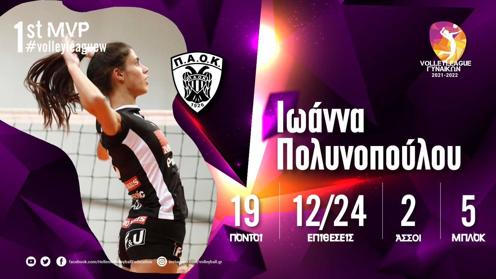 Η Ιωάννα Πολυνοπούλου του Π.Α.Ο.Κ. είναι η MVP της 1ης αγωνιστικής του πρωταθλήματος της Volley League Γυναικών 2021-2022.