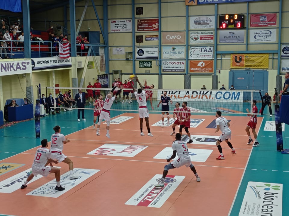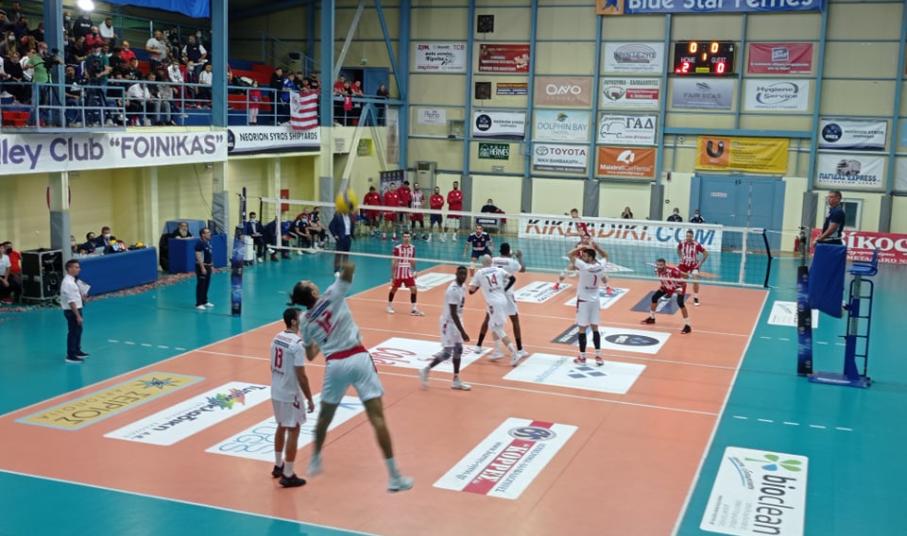 Τώρα όσον αφορά το αγωνιστικό σκέλος της αναμέτρησης οι ερυθρόλευκοι μπήκαν καλύτερα στο παιχνίδι κι εκμεταλλεύτηκαν όλα λάθη των Συριανών. Ο Πέριτς ήταν ο μεγάλος πρωταγωνιστής των Πειραιωτών αφού κανείς από την ομάδα της Σύρου δεν κατάφερε να τον σταματήσει. Επιπλέον ο Φοίνικας ONEX δεν είχε καλή πρώτη πάσα, αφού πιέστηκε πάρα πολύ από τον σέρβις του Ολυμπιακού, με αποτέλεσμα οι φιλοξενούμενοι να έχουν συνεχώς δεύτερες και τρίτες ευκαιρίες. Ακόμη οι γηπεδούχοι δεν κατάφεραν να βγάλουν άμυνες όταν η μπάλα έσπαγε πάνω στο μπλοκ κι αυτό γιατί δεν υπήρχε καλή συνεννόηση εντός του γηπέδου. Από την πλευρά του ο κ. Μπερτίνι προσπάθησε με τα τάιμ άουτ να δώσει οδηγίες και να… ξυπνήσει τους παίκτες του, όμως δεν υπήρχε καμία αντίδραση. Μοναδική εξαίρεση το δεύτερο σετ, εκεί όπου ο Φοίνικας το πάλεψε όμως και πάλι το έχασε από τα δικά του… λάθη.