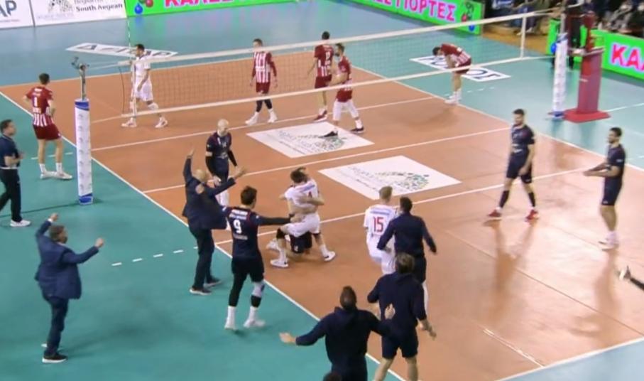 Ο Μιχαΐλοβιτς στην κόντρα επίθεση έκανε το 2-0 για τον Ολυμπιακό. Οι ερυθρόλευκοι ξεκινούν δυναμικά στο παιχνίδι, πιέζοντας το «Πειρατικό» από τη γραμμή του σέρβις και με τον Έγκλεσκανς έκαναν οι ερυθρόλευκοι το 3-0.  Ο Χαραλαμπίδης σταμάτησε τον Στερν για το 5-1 των τυπικά γηπεδούχων. Ο Φράγκος πήρε το μπλοκ άουτ και ο Φοίνικας μείωσε σε 5-2. Ο Τζούριτς με μπλοκ έκανε για τον Φοίνικα το 5-3 σε μία προσπάθεια να επιστρέψουν οι Συριανοί. Ο Μιχάλοβιτς, με επίθεση στην ευθεία, έκανε το 6-5. Ένας εντυπωσιακός πόντος καταλήγει στον Φοίνικα καθώς και οι δύο ομάδες έβγαλαν εντυπωσιακές άμυνες. Προβάδισμα για πρώτη φορά για τους Συριανούς μετά τη λάθος επιθετική προσπάθεια του Ολυμπιακού 7-8.  Ο Έγκλεσκανς στην κόντρα για το 10-8, με τον Ολυμπιακό να κάνει σερί 3-0. Ο Μιχάλοβιτς στην μεγάλη διαγώνιο το 11-10. Άσσος από τον Κόστα 11-11. Ο Τζούριτς με πρώτο χρόνο έκανε το 13-12. Ο Τζούρις με τους πόντους κρατά τον Φοίνικα κοντά στο σκορ 14-13. Ο Πέριτς πήρε το μπλόκ άουτ 16-13 και η διαφορά στο +3 για τον Ολυμπιακό και ο τεχνικός της ομάδας Σύρου κάλεσε τάιμ άουτ. Ο Κόστα σαν σε προπόνηση μείωσε σε 18-16 για τους Συριανούς. Ο Παγένκ με πρώτο χρόνο έκανε το 20-17. Στο φιλέ το σέρβις του Κόστα 21-18. Ο Μιχαΐλοβιτς στη κόντρα σε ένα κρίσιμο σημείωσε έκανε το 22-18 και ο κ. Γιόσκο Μιλενκόνσκι κάλεσε τάιμ άουτ. Άσσος από τον Μιχάλοβιτς 22-20. Παράβαση από τον Ανδρεάδη και ο Φοίνικας με σερί 1-4 μείωσε σε 23-22. Επαφή με τον φιλέ ο Ένκλεσκανς και το σκορ έγινε 23-23. Τριπλό μπλοκ για τους Συριανούς και 23-24. Ο Στερν πήρε το μπλοκ άουτ με τους Συριανούς να κάνουν την πλήρη ανατροπή και να προηγούνται στο σκορ με 0-1 έπειτα το 23-25.