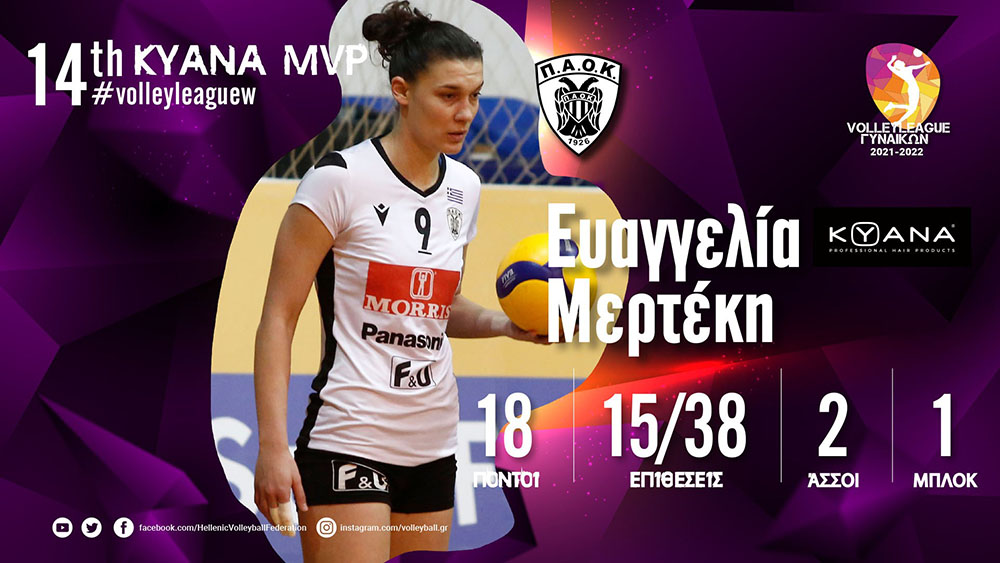 Η Ευαγγελία Μερτέκη του Π.Α.Ο.Κ. αναδείχθηκε KYANA MVP της 14ης αγωνιστικής της Volley League Γυναικών. Η διεθνής ακραία του Δικεφάλου στο ντέρμπι κόντρα στον Α.Ο. Θήρας στη Σαντορίνη ήταν η πρώτη σκόρερ με 18 πόντους (15/38 επ., 2 άσσους, 1 μπλοκ), έχοντας μόλις δύο λάθη στην υποδοχή σε 22 προσπάθειες.
