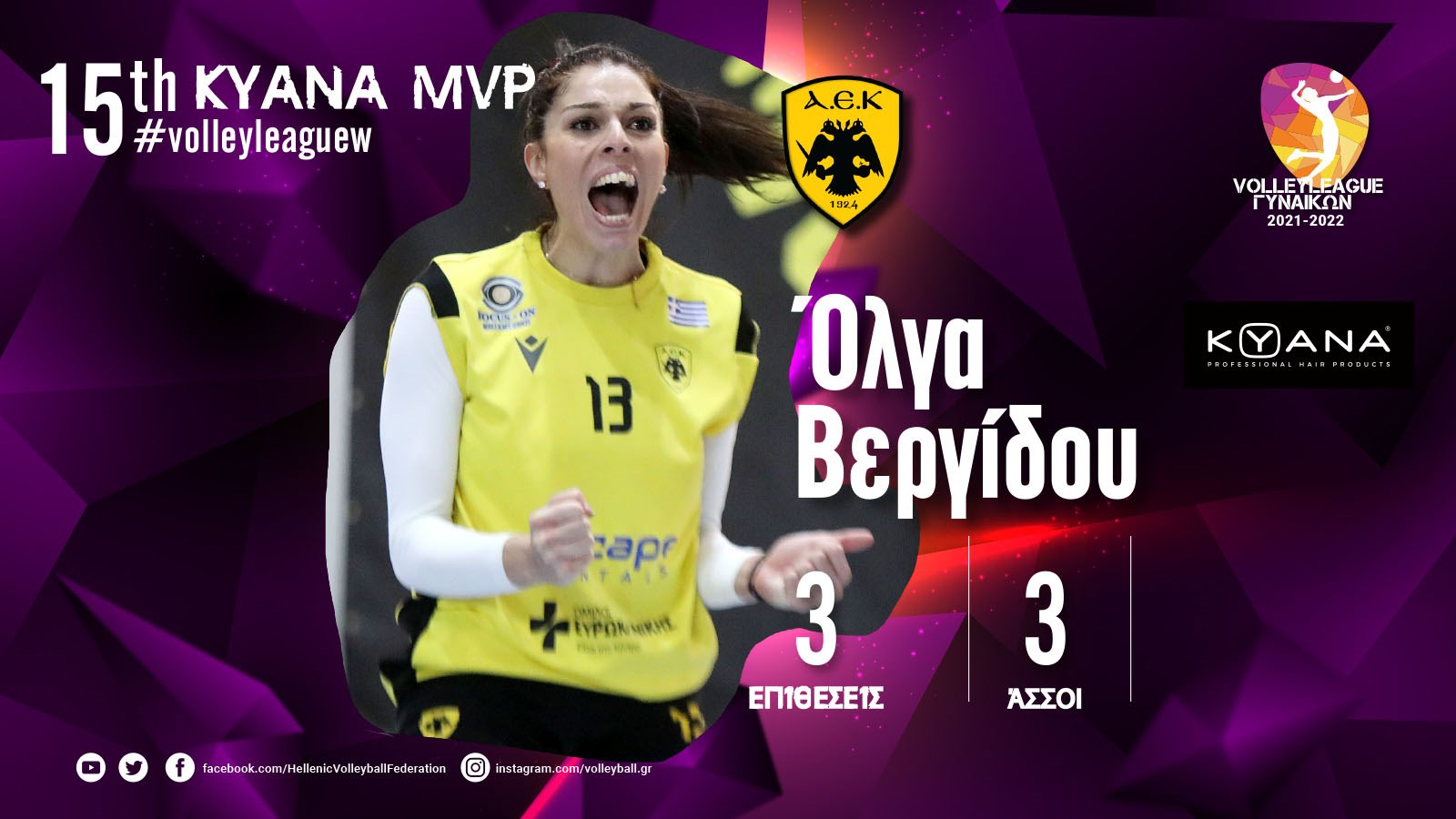 Η Όλγα Βεργίδου είναι η KYANA MVP της 15ης αγωνιστικής της Volley League Γυναικών. Η διεθνής πασαδόρος της Α.Ε.Κ. ήταν η κορυφαία στην μεγάλη εκτός έδρας νίκη της Ένωσης στην έδρα του Π.Α.Ο.Κ. με 3-1 σετ.