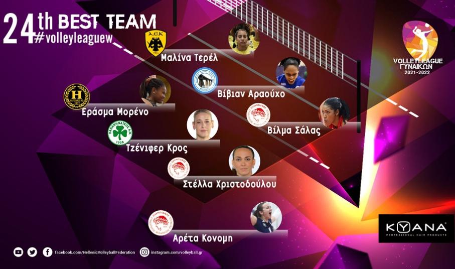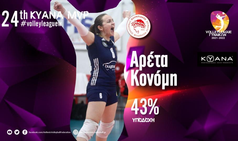 Η Αρέτα Κονόμη αναδείχθηκε KYANA MVP της 24ης αγωνιστικής της Volley League Γυναικών. Η πολύπειρη λίμπερο του Ολυμπιακού ήταν εξαιρετική στο ντέρμπι αιωνίων κόντρα στον Παναθηναϊκό (43% υποδοχή με 36% άριστες χωρίς κανένα λάθος και μεγάλη βοήθεια στην άμυνα) και με το τρίποντο που κατέκτησε η ομάδα της πλησίασε στους τρεις πόντους από την κορυφή κι ενώ απομένουν δύο αγωνιστικές για το φινάλε της κανονικής περιόδου.