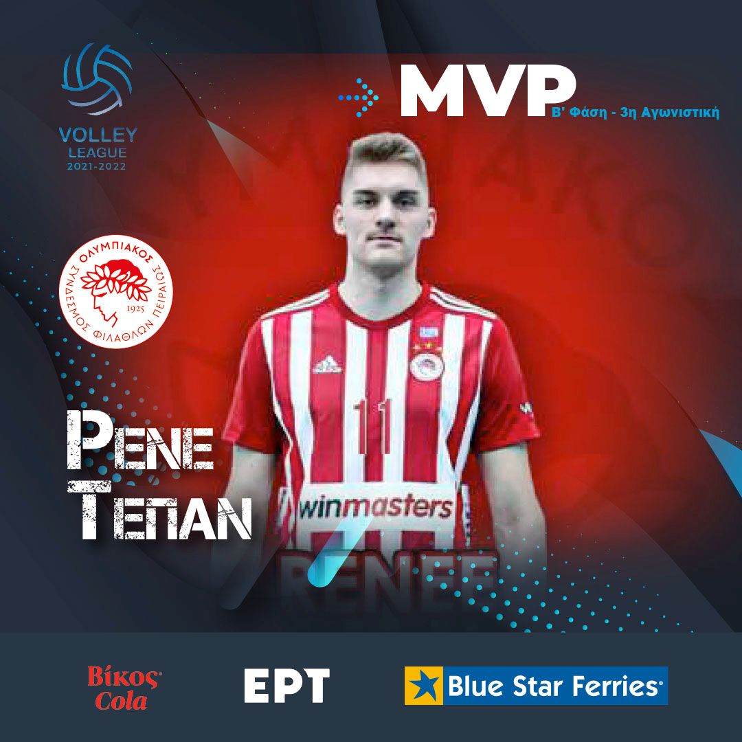 Ο Eσθονός διαγώνιος του Ολυμπιακού Ρενέ Τέπαν αναδείχτηκε MVP Βίκος Cola στην 3η αγωνιστική της B΄ φάσης του πρωταθλήματος Volley League 2021-22: