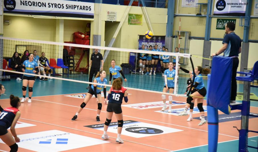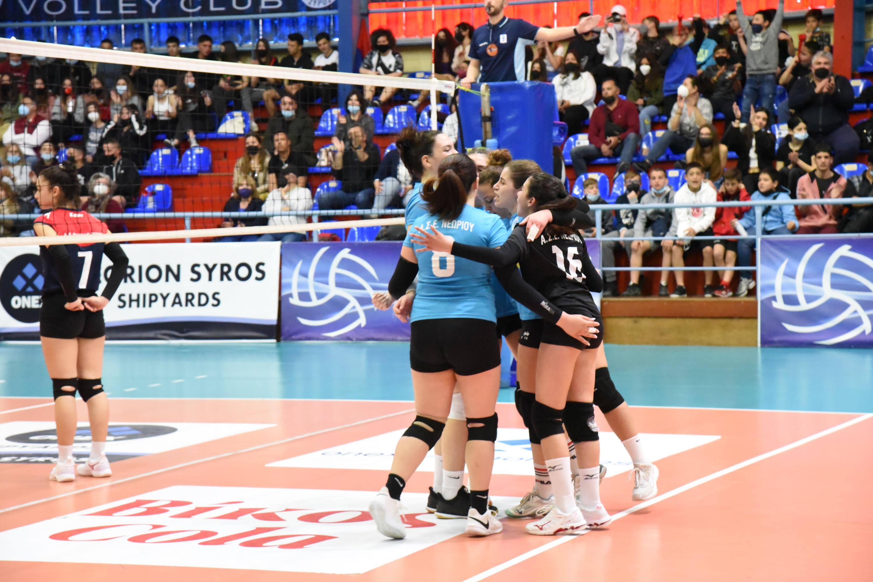 Αρχικά ο Φοίνικας Σύρου, με ένα σερί πόντων και με ανατροπή κατάφερε να κάνει το 0-1 μετά το 25-27. Οι αθλήτριες του Χρήστου Σκρέτα στη συνέχεια αντέδρασαν εντυπωσιακά, αφού δεν άφησαν κανένα περιθώριο αντίδρασης στον Φοίνικα και ισοφάρισαν σε 1-1 μετά το 25-10.