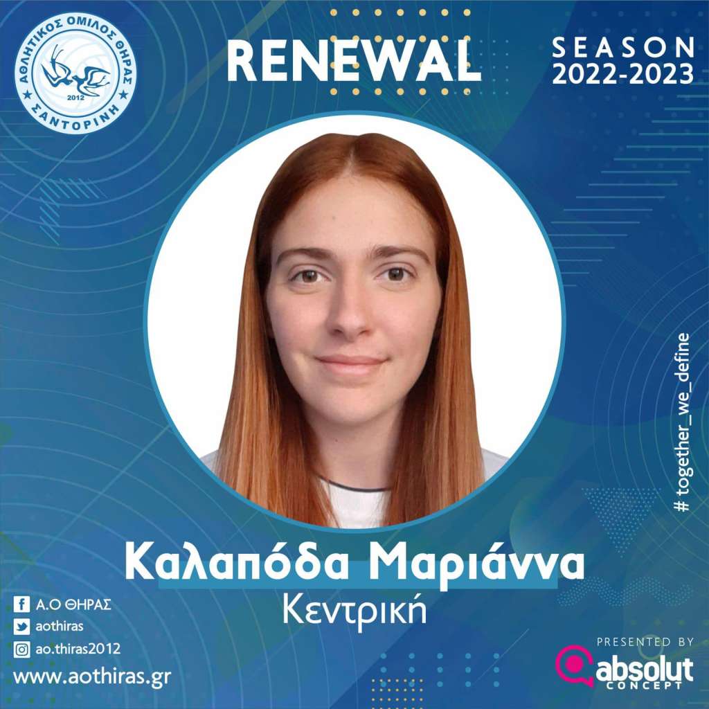 Η διοίκηση του Α.Ο. Θήρας. ανακοινώνει την ανανέωση της συνεργασίας του με την Μαριάννα Καλαποδα. Η 21χρονη Βολιώτισσα κεντρική (1.90μ), που από την πρώτη της κιόλας παρουσία στην ομάδα μας εξελίχθηκε σε βασικό της στέλεχος, μετά την περσινή της ατυχία και τον τραυματισμό της στην εντός έδρας αναμέτρηση της 8ης αγωνιστικής της Volley League με τον Άρη Θεσσαλονίκης, επανέρχεται δυναμικά στις υποχρεώσεις της και θα συνεχίσει να αγωνίζεται στα «χρώματα» του Α.Ο. Θήρας τη νέα αγωνιστική περίοδο 2022-2023.
