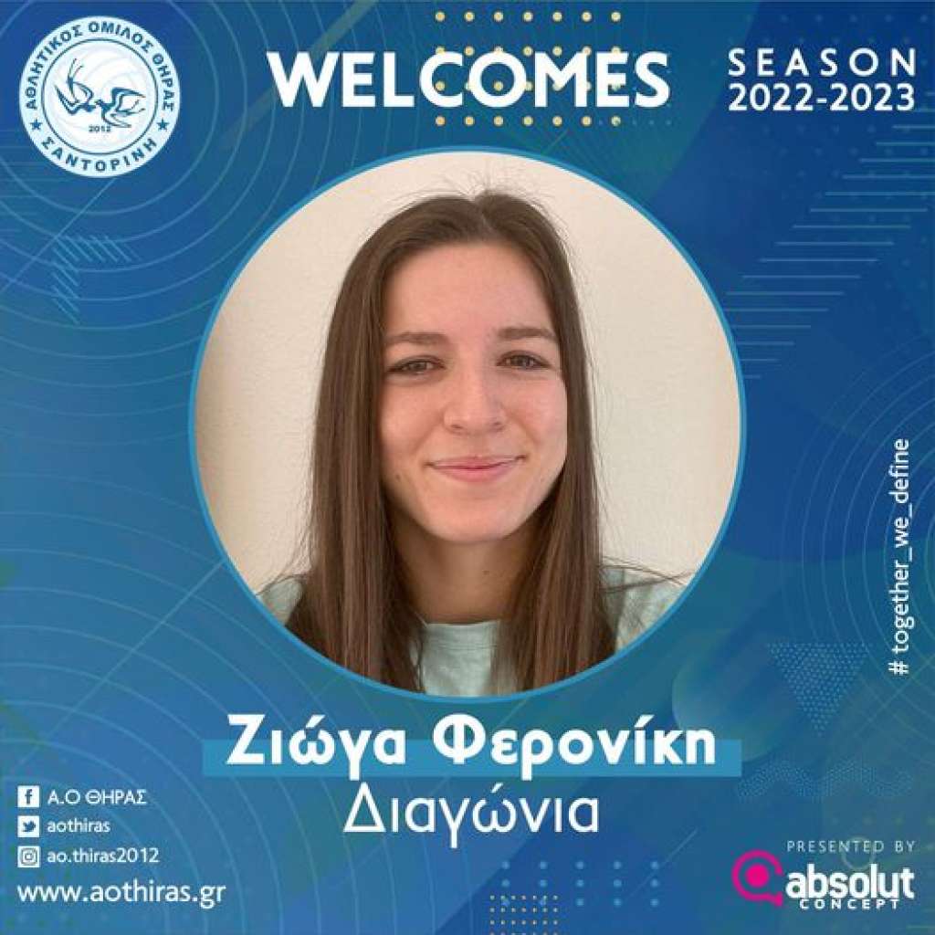 «Η διοίκηση του Α.Ο Θήρας ανακοινώνει την έναρξη της συνεργασίας του με την 26χρονη Φερονίκη Ζιώγα. Η πρώην αθλήτρια του Ολυμπιακού, με ύψος 1,84μ, αγωνίζεται ως διαγώνια και εντάσσεται στο δυναμικό της ομάδας μας για την αγωνιστική περίοδο της Volley League γυναικών 2022-2023.