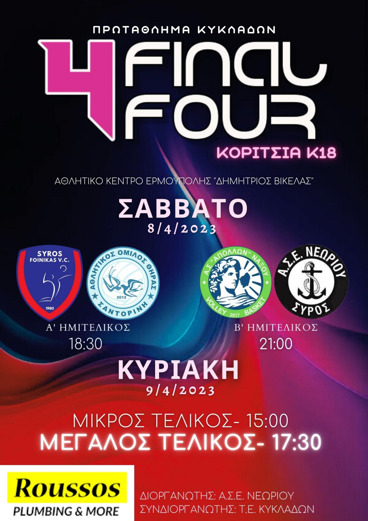 Η γιορτή του βόλεϊ και αυτό το Σαββατοκύριακο στη Σύρο με το final-4 κοριτσιών Κ18. Για μία ακόμη φορά η ομάδα μας με τη βοήθεια του μεγάλου μας χορηγού "ROUSSOS plumbing & more" διοργανώνει το final-4 της κατηγορίας κορασίδων.