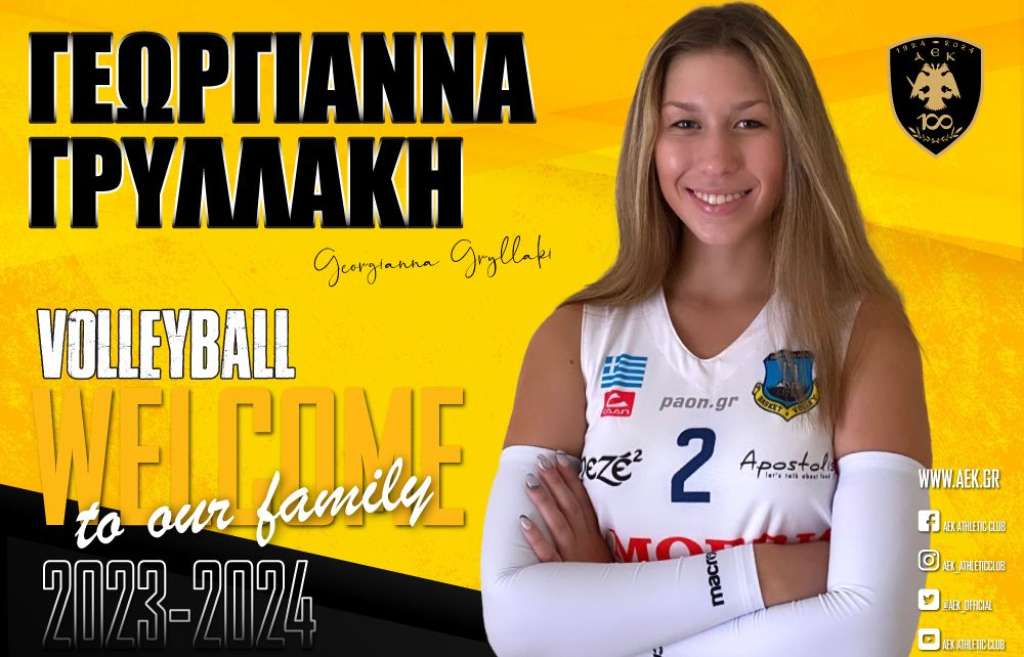 Η ΑΕΚ βρίσκεται στην ευχάριστη θέση να ανακοινώσει την έναρξη της συνεργασίας της με την Γεωργιάννα Γρυλλάκη. Η 17χρονη (02/05/2006) λίμπερο, ύψους 1,70 μ., υπέγραψε το συμβόλαιό της και εντάσσεται στο δυναμικό της γυναικείας ομάδας Βόλεϊ του Συλλόγου.