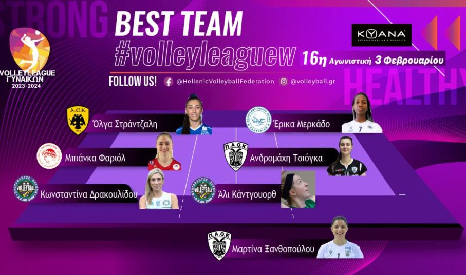 Στην κορυφαία επτάδα της 16ης αγωνιστικής συμπεριλήφθηκε η διαγώνιος του Α.Ο. Θήρας Έρικα Μερκάδο. Η έμπειρη διαγώνιος βοήθησε τα μέγιστα την ομάδα της ώστε να φτάσει σε μία ακόμη νίκη. Να σημειώσουμε εδώ πως την 16η αγωνιστική ο Α.Ο. Θήρας έπαιξε εκτός έδρας με τον Ο.Φ.Α. Απολλώνιος και επικράτησε με 2-3 στο τάι μπρέικ.