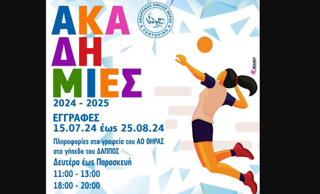 Στην ανακοίνωση, αναφέρουν: “Αν θέλεις κι εσύ να γίνεις μέλος αυτής της αθλητικής οικογένειας, σε περιμένουμε με ανοιχτές αγκάλες! Οι εγγραφές για τη νέα σεζόν στον Α.Ο. Θήρας ξεκίνησαν και θα διαρκέσουν έως 25 Αυγούστου. Ελάτε να ενταχθείτε σε μια ομάδα που καλλιεργεί το ταλέντο, την ομαδικότητα και την αγάπη για το βόλεϊ.