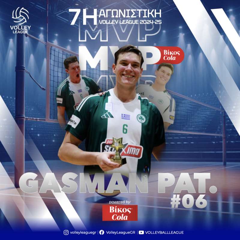 Ο Αμερικανός κεντρικός του Παναθηναϊκού Πατρίκ Γκάσμαν αναδείχτηκε πολυτιμότερος αθλητής MVP Βίκος Cola της 7ης αγωνιστικής στο πρωτάθλημα Volley League 2024-25.