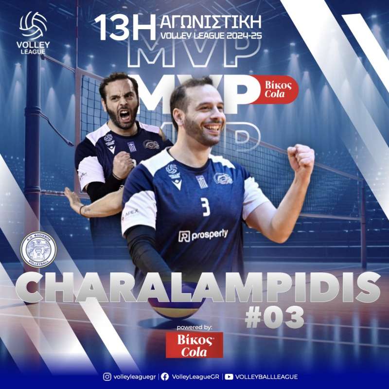 Ο κεντρικός του Α.Ο. Φλοίσβου Παλαιού Φαλήρου, Δημήτρης Χαραλαμπίδης αναδείχτηκε πολυτιμότερος αθλητής (MVP) της 13ης αγωνιστικής στο πρωτάθλημα Volley League 2024-25.