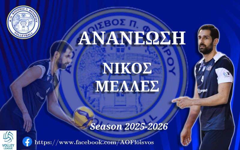 Ο ΑΟ Φλοίσβος Παλαιού Φαλήρου είναι στην ευχάριστη θέση ν’ ανακοινώσει την ανανέωση συνεργασίας, για την αγωνιστική περίοδο του πρωταθλήματος της Volley League 2025-2026, με τον κεντρικό Νίκο Μελλέ.