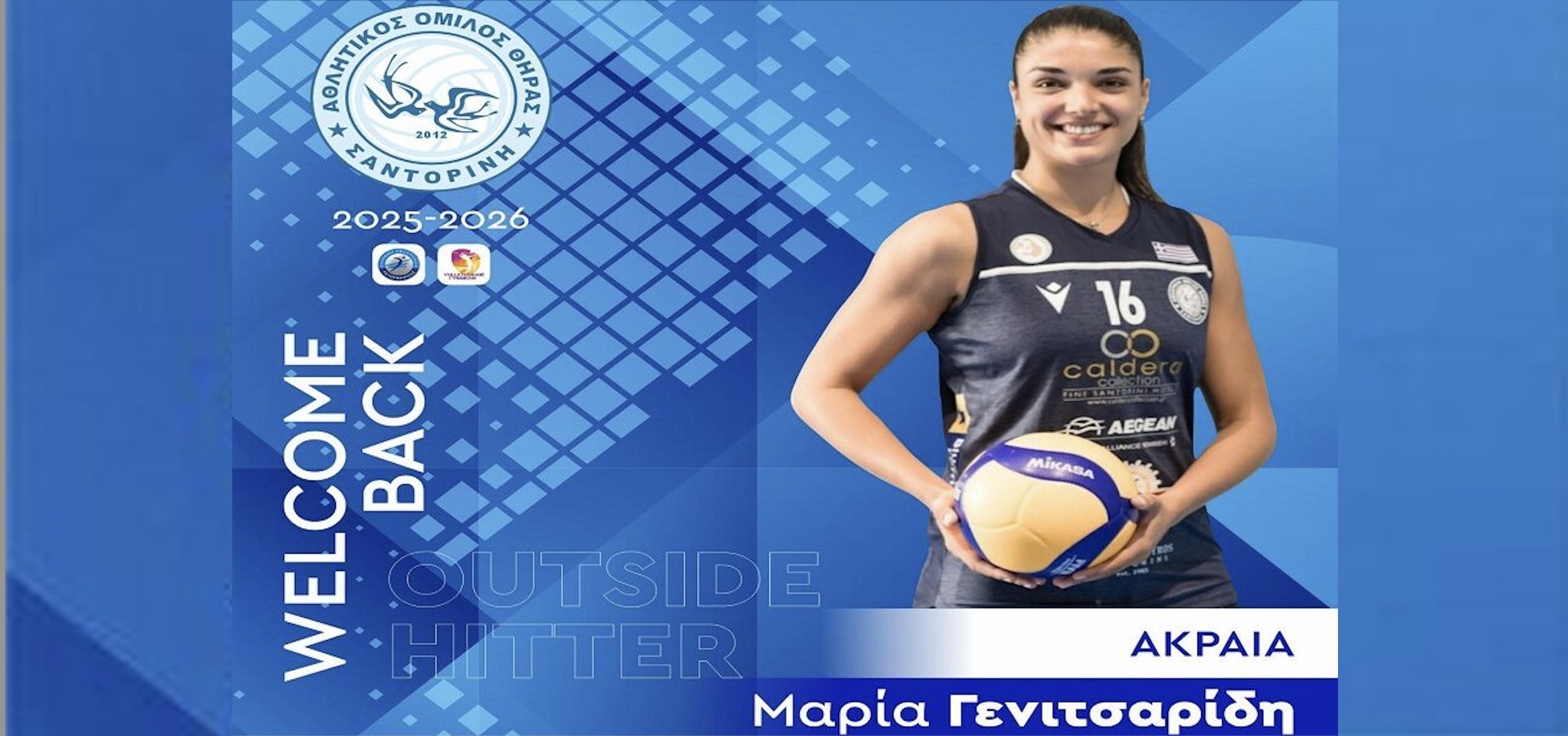 Η διοίκηση του Α.Ο. Θήρας βρίσκεται στην ευχάριστη θέση να ανακοινώσει την έναρξη της συνεργασίας της με τη διεθνή ακραία Μαρία Γενιτσαρίδη για την αγωνιστική περίοδο 2025-2026 της Volley League Γυναικών.