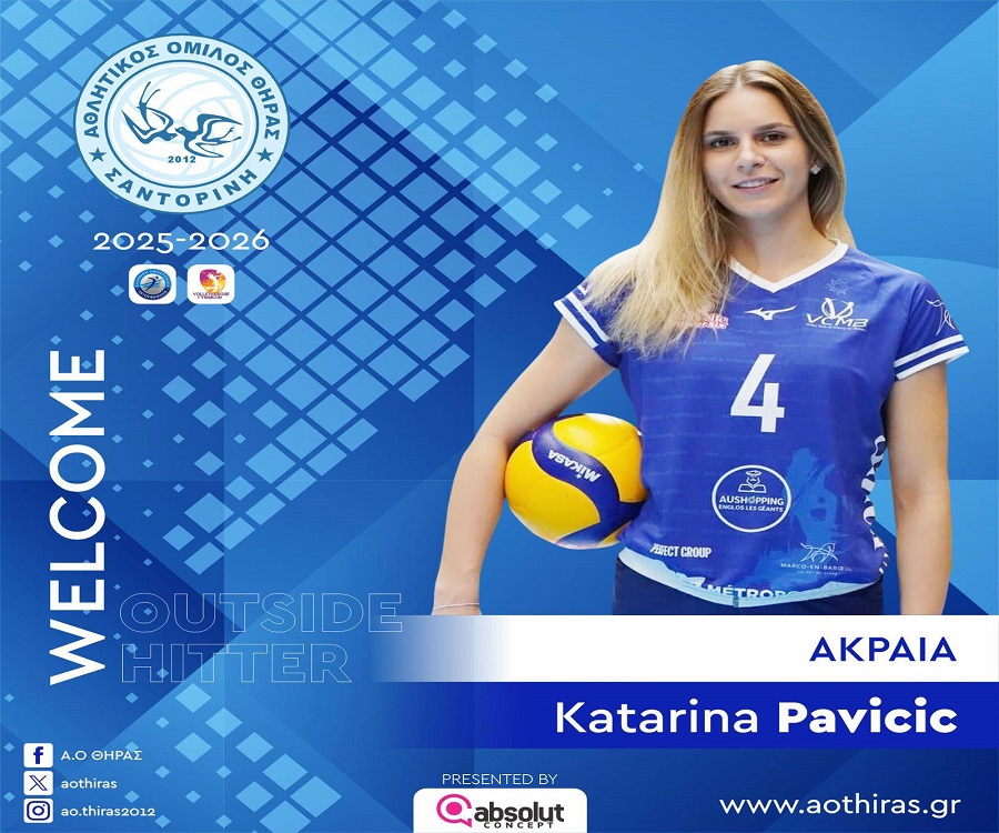 Η διοίκηση του Α.Ο. Θήρας βρίσκεται στην ευχάριστη θέση να ανακοινώσει την έναρξη συνεργασίας με τη διεθνή αθλήτρια της Κροατίας, Καταρίνα Πάβιτσιτς για την αγωνιστική περίοδο 2025-2026 Volley League Γυναικών.