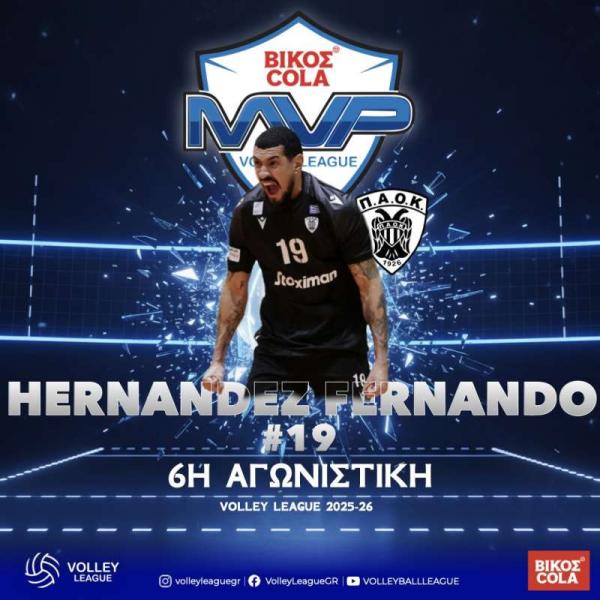 Ο Κουβανός διαγώνιος του Π.Α.Ο.Κ. Φερνάντο Ερνάντεζ αναδείχτηκε MVP Βίκος Cola της 6ης αγωνιστικής του πρωταθλήματος Volley League 2025-26.