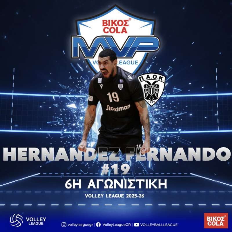Ο Κουβανός διαγώνιος του Π.Α.Ο.Κ. Φερνάντο Ερνάντεζ αναδείχτηκε MVP Βίκος Cola της 6ης αγωνιστικής του πρωταθλήματος Volley League 2025-26.