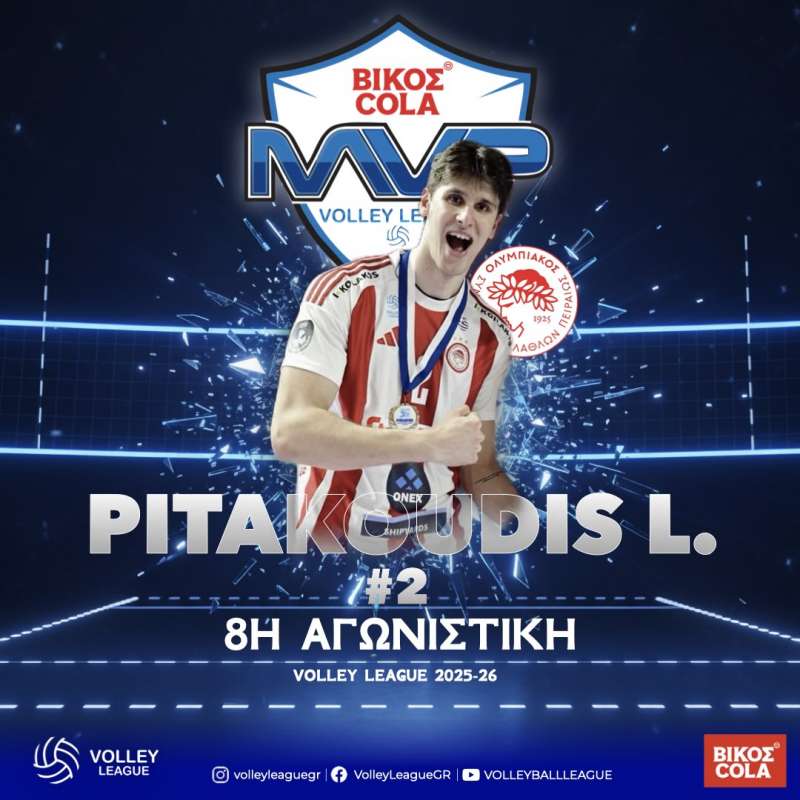 Ο κεντρικός  του Ολυμπιακού Σ.Φ.Π.,  Λάμπρος Πιτακούδης,  αναδείχτηκε MVP της 8ης αγωνιστικής του πρωταθλήματος Volley League 2025-26.