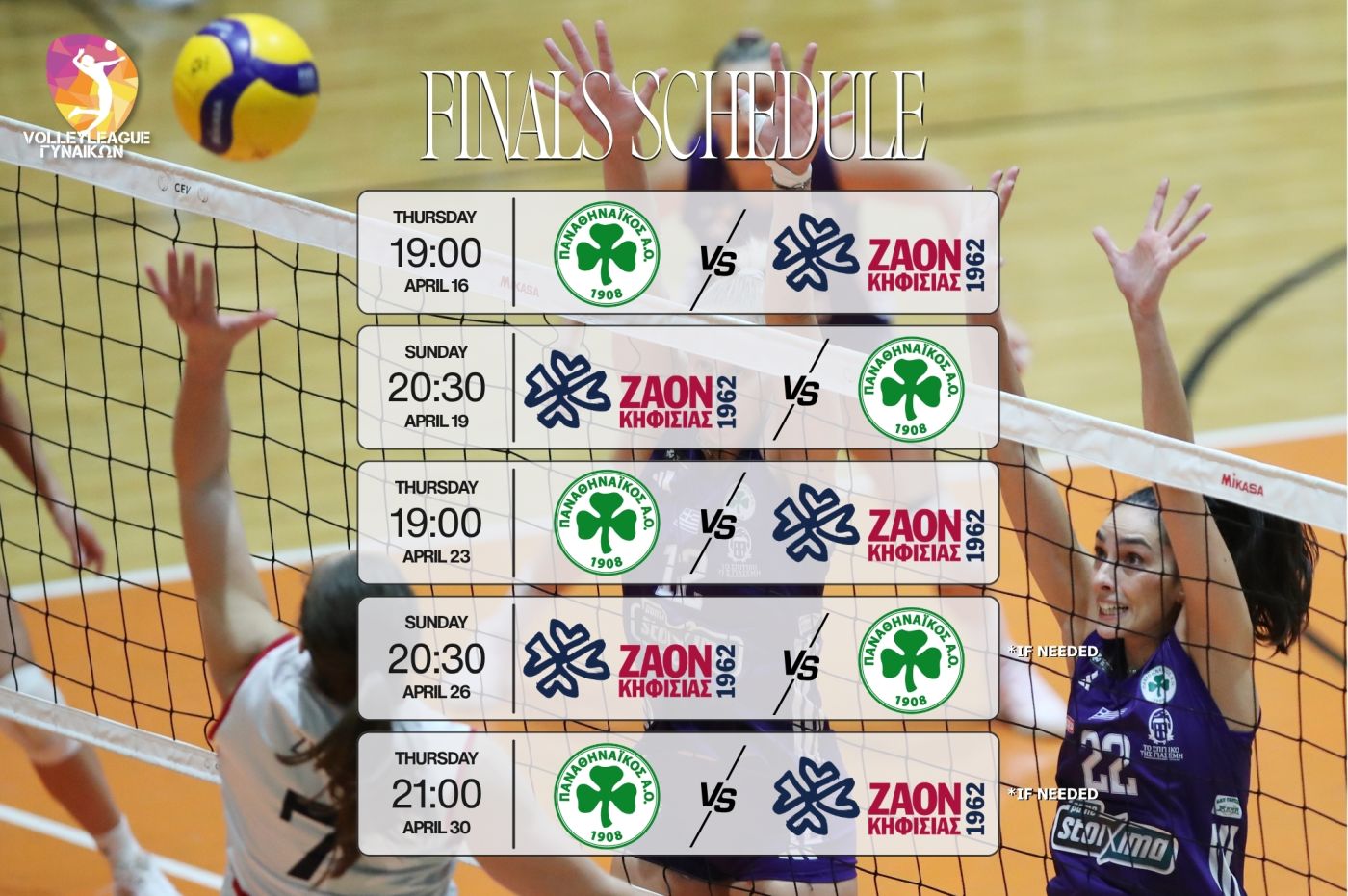 Το πρόγραμμα των τελικών της Volley League γυναικών ανάμεσα στον Παναθηναϊκό και τον Ζ.Α.Ο.Ν.