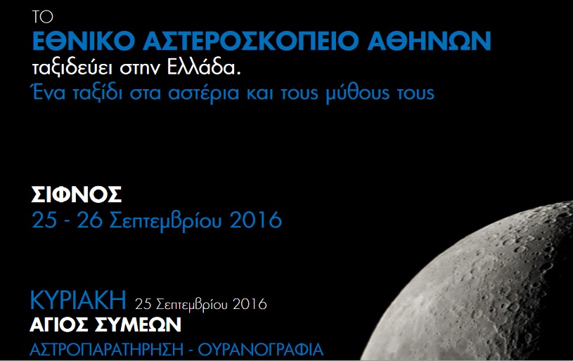 Το Εθνικό Αστεροσκοπείο Αθηνών σε συνεργασία με το Δήμο Σίφνου διοργανώνουν μία σειρά από δράσεις στο νησί την Κυριακή 25 Σεπτεμβρίου και τη Δευτέρα 26 Σεπτεμβρίου, στα πλαίσια των ενεργειών του ΕΑΑ για τη διάχυση της επιστήμης της Αστρονομίας στο ευρύ κοινό.